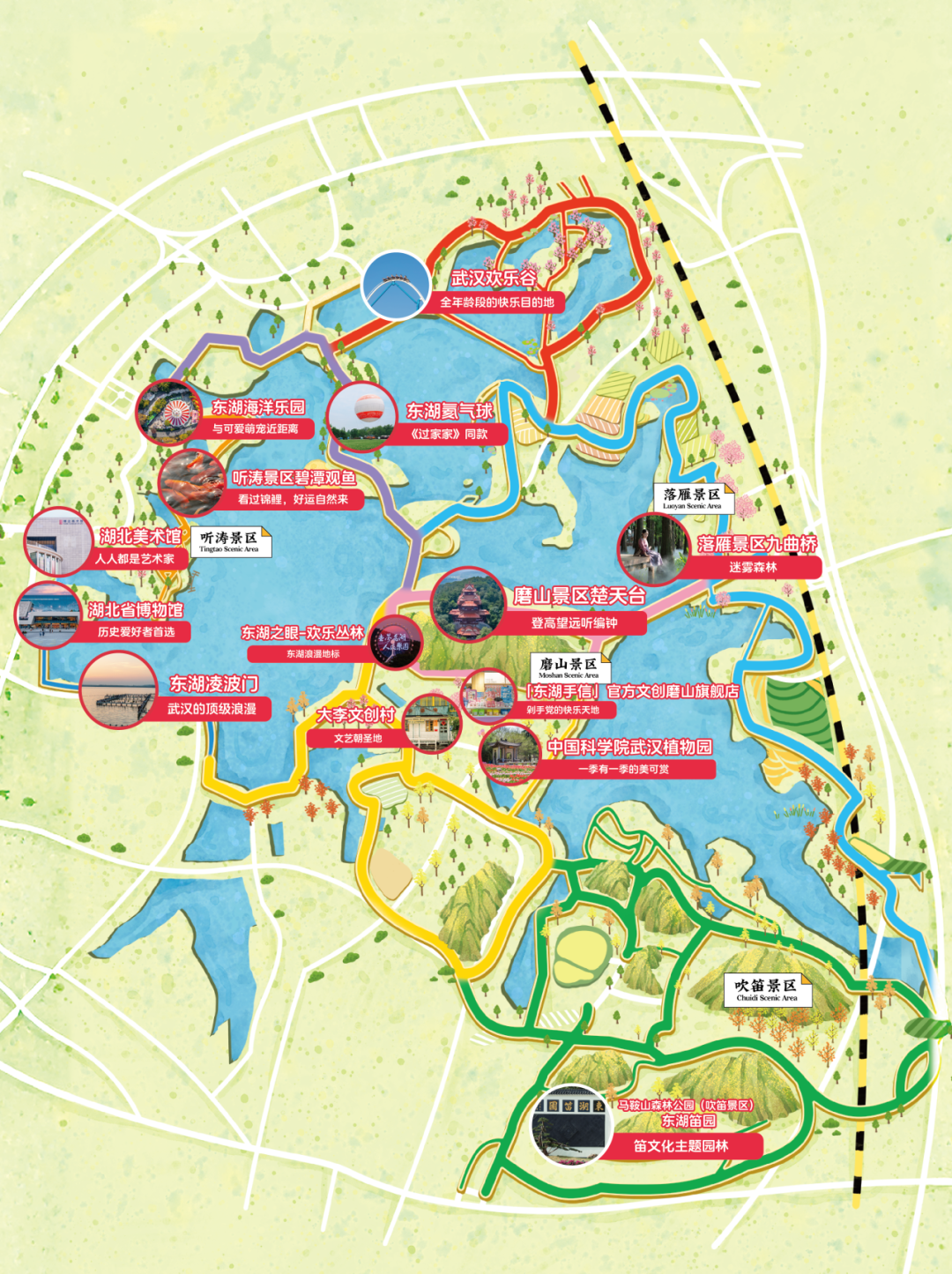 梦花源、追风栈道、东湖笛园、东湖梅山