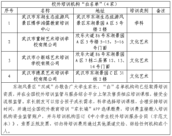 为落实中央和省、市“双减”文件精神和要求,加强对我区校外培训机构的全流程监管,有效防范“赚钱跑路”“退费难”等问题,区教育局再次提醒广大家长,要汲取近期各地发生的事故教训,为防范各类安全事故发生,保证您的合法权益及孩子的生命安全,现将我区2025年第三批校外培训机构“白灰黑”名单予以公布。