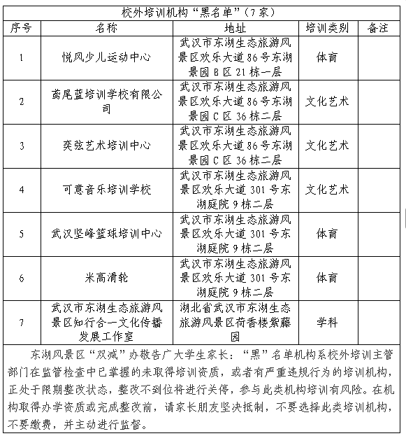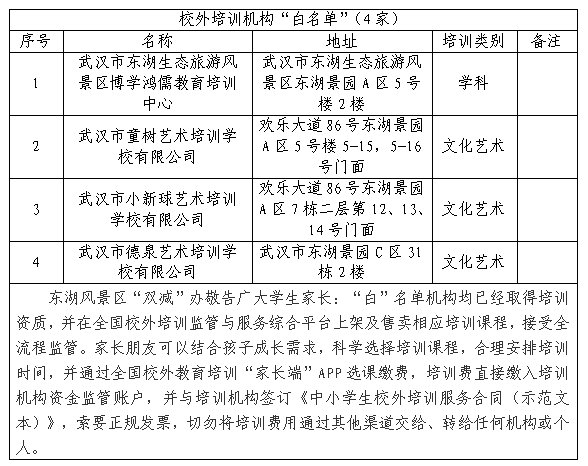 为落实中央和省、市“双减”文件精神和要求,加强对我区校外培训机构的全流程监管,有效防范“赚钱跑路”“退费难”等问题,区教育局再次提醒广大家长,要汲取近期各地发生的事故教训,为防范各类安全事故发生,保证您的合法权益及孩子的生命安全,现将我区2025年第四批校外培训机构“白灰黑”名单予以公布。